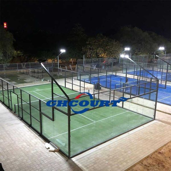 Three expansive 20m x 10m outdoor padel courts rise as a bold fusion of precision engineering and immersive design. Clad in sleek pure-black steel, the panoramic structures frame the courts with a striking modern silhouette, while the dual-tone dark blue and green turf mimics natural landscapes, enhancing both visual depth and gameplay dynamics.